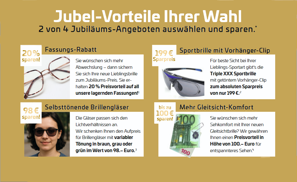 Jeder Preisvorteil kann nur 1x gewählt werden. Die Kombination einzelner Gutscheine ist abhängig von der technischen Machbarkeit. Nicht mit anderen Aktionen kombinierbar. Gültig bis 30.November 2025. Rabatt bezieht sich auf den UVP des Herstellers. Nur gültig auf lagernde Fassungen, solange der Vorrat reicht. Nicht mit anderen Gutscheinen kombinierbar. | Erhältlich bis Sphäre +/- 6.00 dpt. | cyl. 2.00 dpt. | Sie bezahlen nur den Preis für farblose Brillengläser. | Nur gültig für Marken-Gleitsichtgläser.